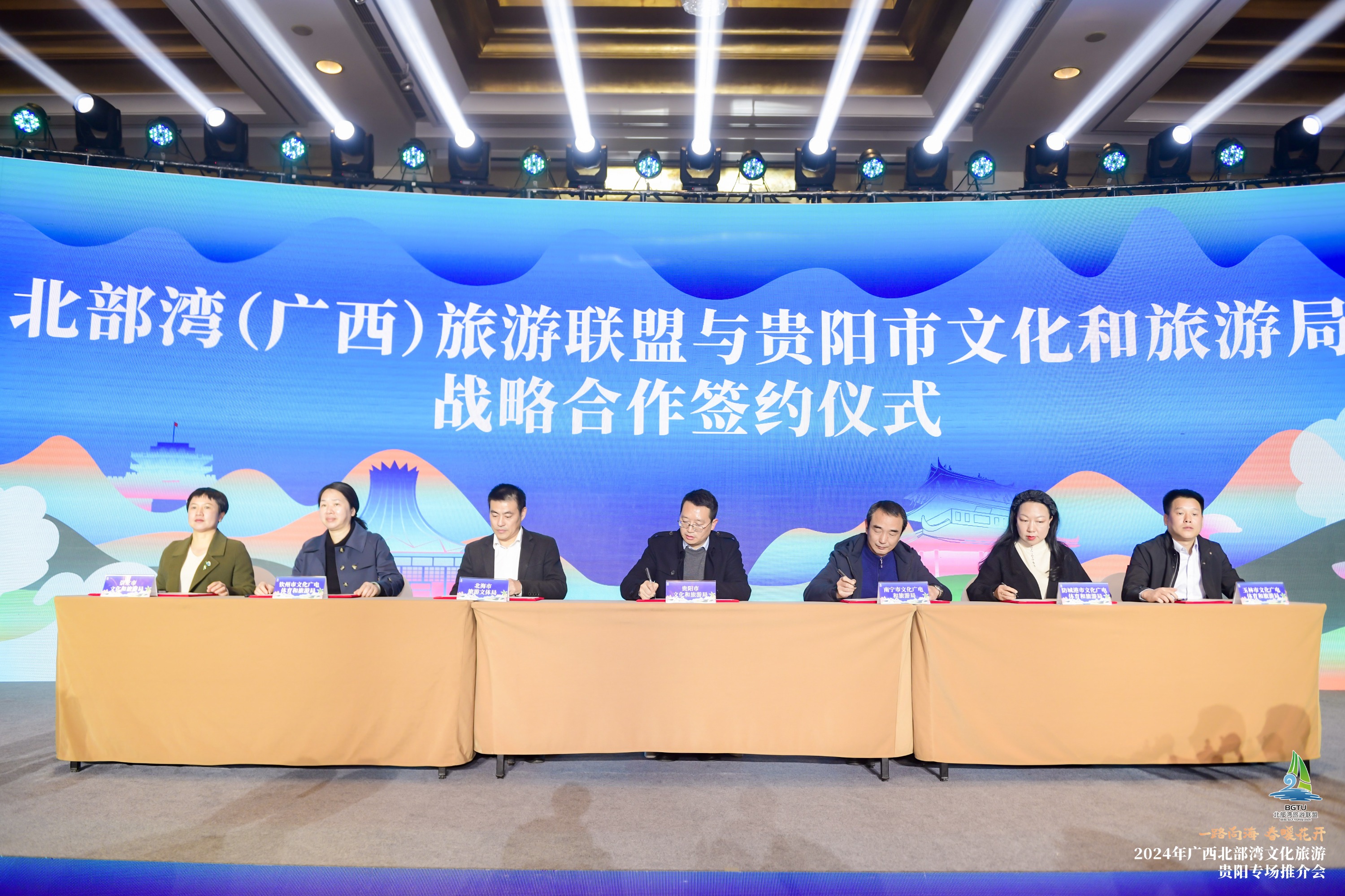 北部湾文化旅游贵阳专场推介会现场开设“风光北部湾”特色打卡装置及“风物北部湾”特色文旅商品展区,开展“风情北部湾”特色文艺节目表演,立体展示广西北部湾特色文旅商品、文旅资源、美食特产等;推出“趣边关”“趣海边”“趣岭南”三种畅游广西北部湾的花样玩法,一程多站,看遍广西北部湾的无限风光。为进一步推动北部湾(广西)旅游联盟6市与贵阳市文化和旅游行业的交流与合作,实现联动共赢,推介会上北部湾(广西)旅游联盟6市与贵阳文化和旅游局签署北部湾(广西)旅游联盟—贵阳文化旅游交流合作战略框架协议。