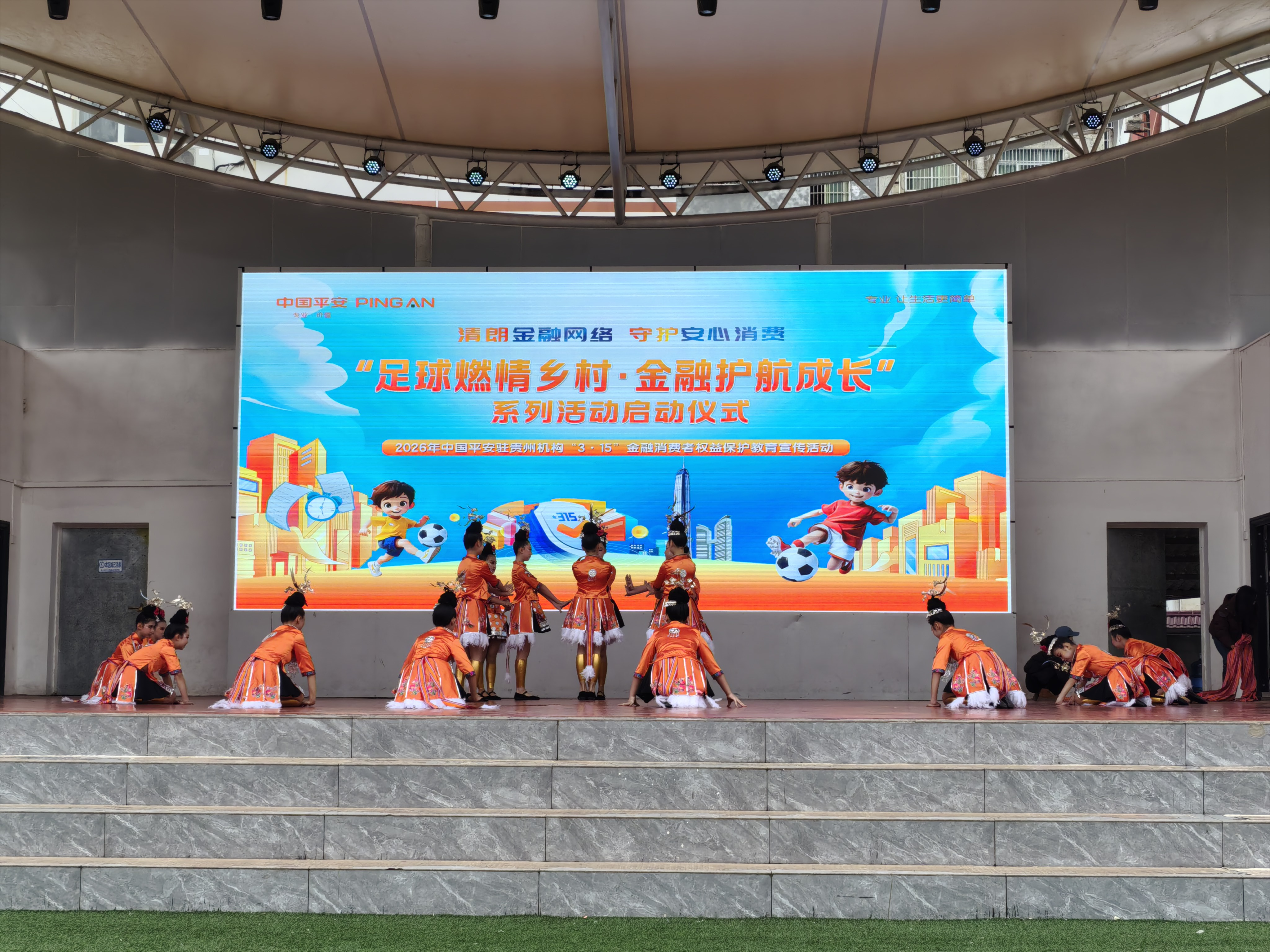 活动当天,学生带来了民族舞蹈、村超进行曲等精彩表演,现场气氛热烈。启动仪式别具匠心,采用足球形式进行,象征金融消保知识如球入网,精准触达人心,充分体现了“金融+体育”的融合创新。