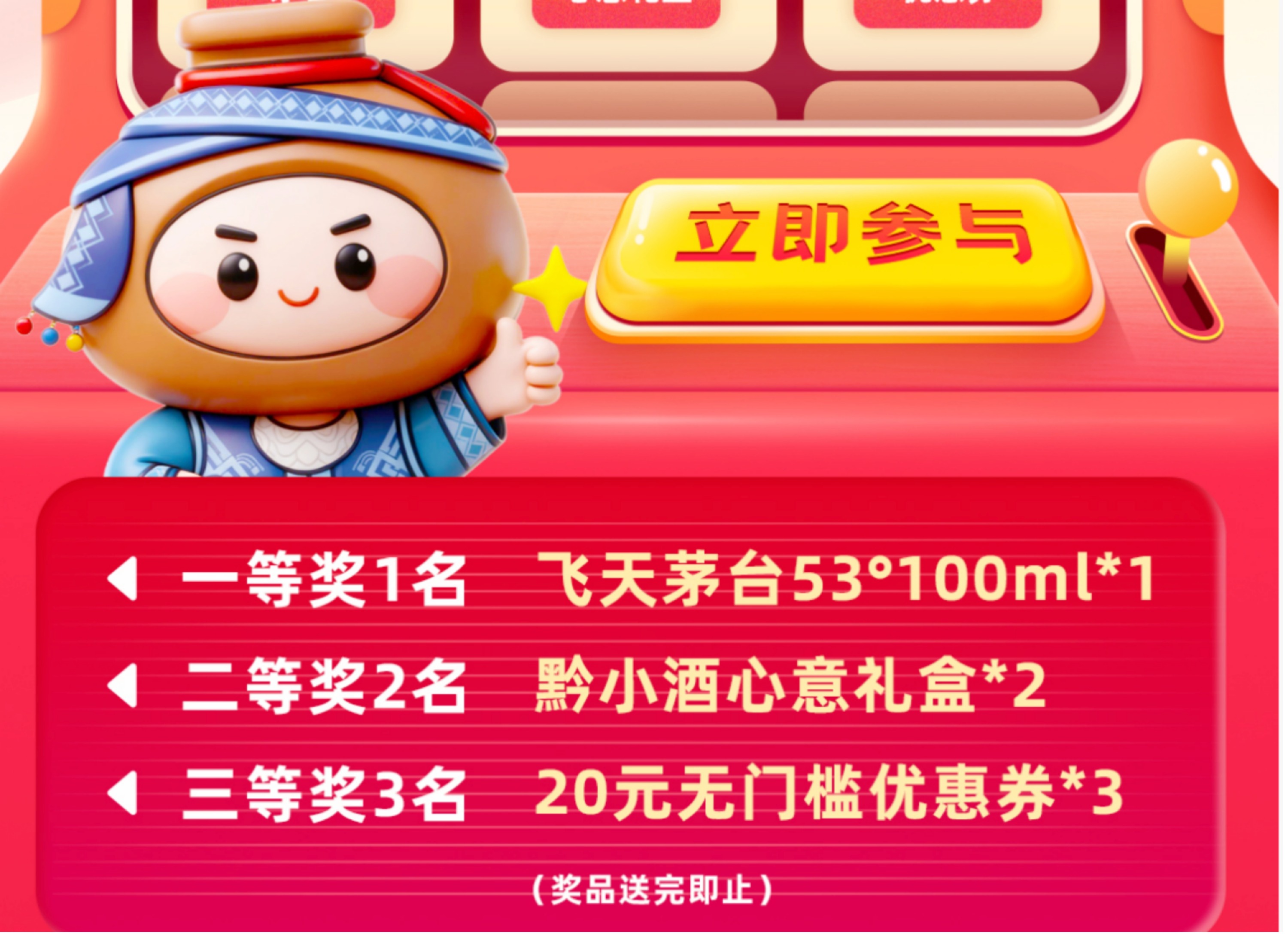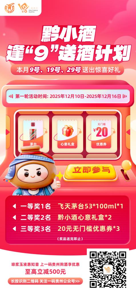 贵州白酒消费券活动开展以来,通过8.8折购酒优惠(单笔最高立减500元)吸引了广大消费者的广泛关注与积极参与。在此基础上,为进一步回馈消费热情,12月9日起,一码贵州平台将联合“黔小酒”IP推出月度“逢9送酒”月度福利活动。