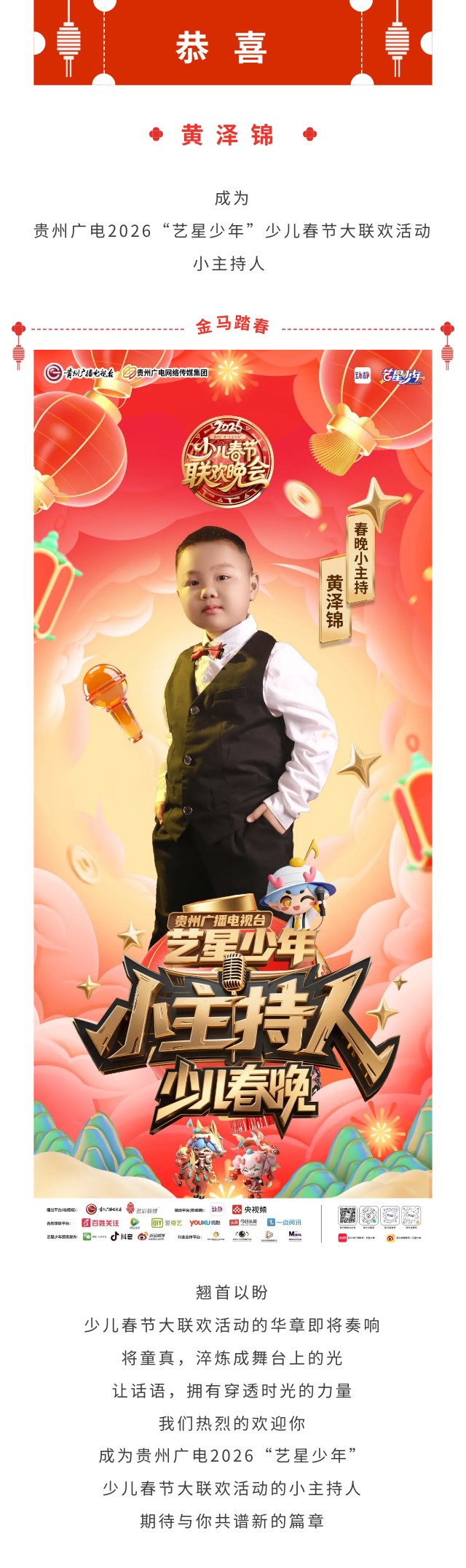 黄泽锦 | 贵州广电2026“艺星少年”少儿春节大联欢活动小主持人!