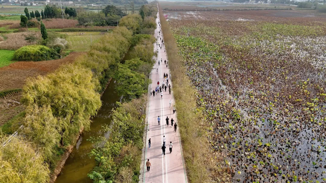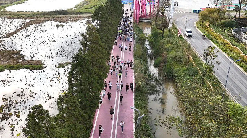 上午8点30分,伴随着发令枪响,8公里健康路跑正式开始。选手们如离弦之箭冲出起点、涌入赛道,迎着晨曦在秋风与美景中肆意奔跑,浩浩荡荡的参赛队伍宛如一条长龙,在风景秀美的荷塘之畔尽情释放活力。参赛选手高金娣说:“我参加这个活动已经是第二次了,我觉得这里的风景很美,跑下来感觉很舒服,空气很清新,围绕着十里荷塘跑步,可以边跑边欣赏这里的风景。”
