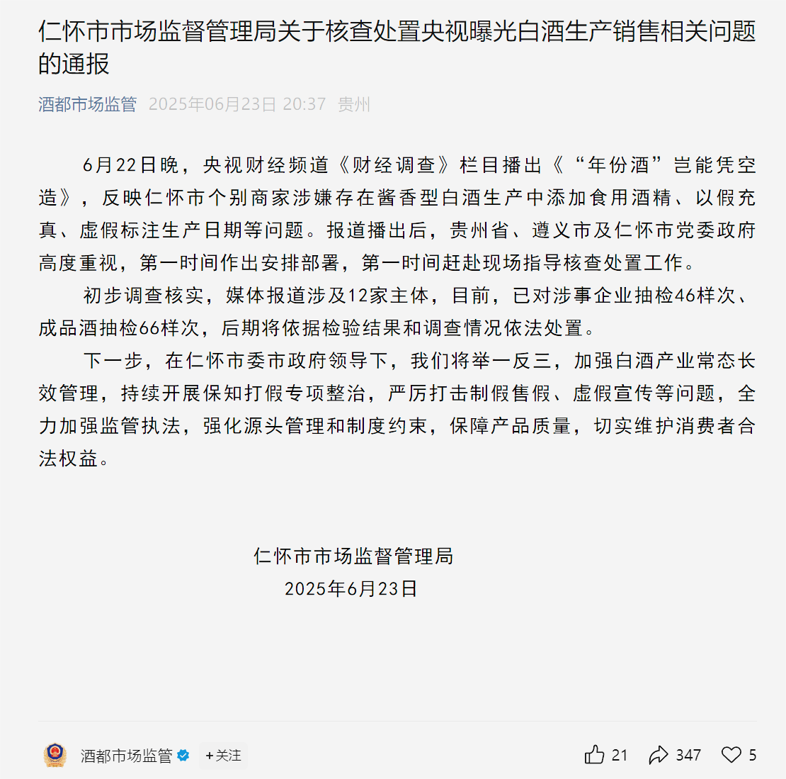 酒业动静丨央视曝光年份酒问题 仁怀市抽检12家涉事企业
