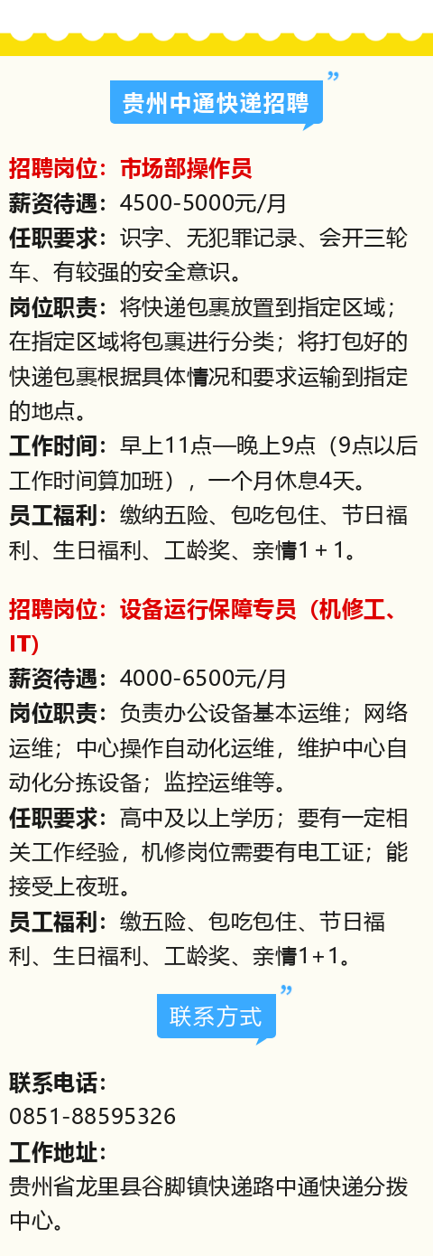 【知名企业】贵州中通快递招聘!月薪4000-6500元!包吃包住!