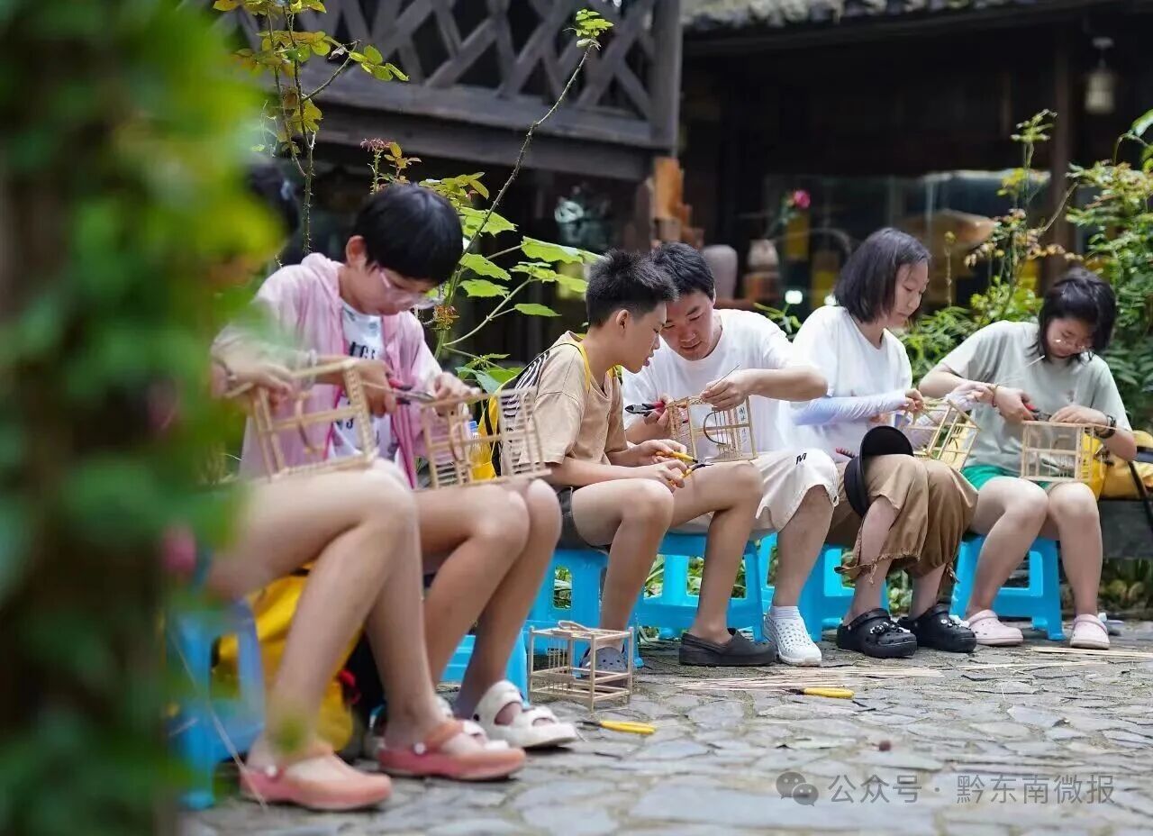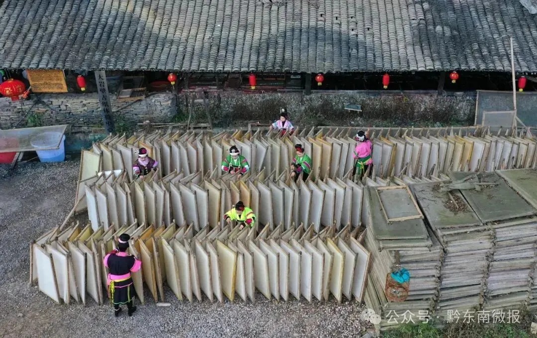 在丹寨万达小镇,“非遗+旅游”的业态融合成为联动发展的典范。作为西江千户苗寨的重要联动伙伴,丹寨县以万达小镇为核心,联动石桥、卡拉等非遗村寨,推出“非遗深度游”路线,让古法造纸、鸟笼制作、苗族蜡染等非遗技艺“活”起来。在南皋乡石桥村,国家级非物质文化遗产代表性传承人王兴武带领合作社创新运用千年古法造纸技艺,开发出16大系列160余种纸张产品,涵盖包装、装饰、文创等多个领域,深受市场欢迎。村里的造纸工坊还打造了研学体验项目,游客可以亲手参与造纸过程,制作专属的文创产品。“以前我们村民靠种地为生,现在不少人在工坊做纸或在民宿打工,‘非遗+旅游’带动村里90多人就业。”石桥村村民张月秀说,自家的日子跟着古法造纸一起“火”了起来。
