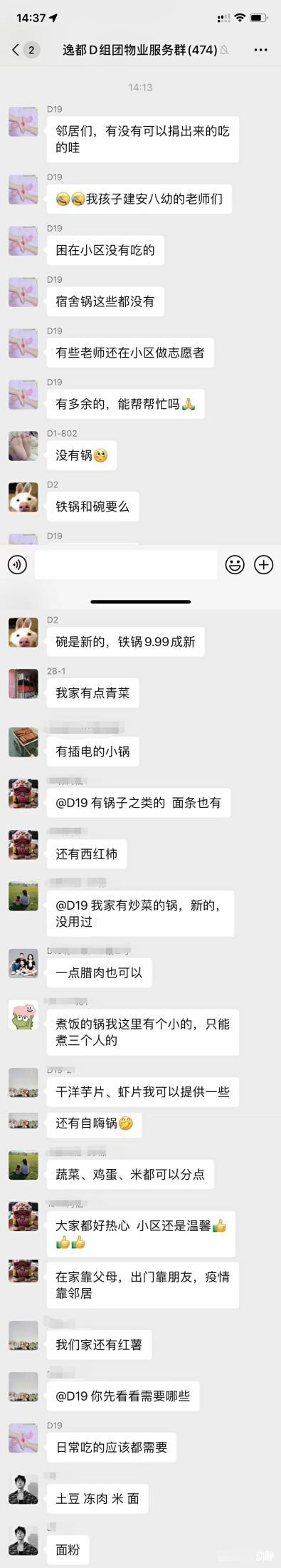 “真的心痛,都是二十多岁的小姑娘,白天那么辛苦当志愿者,回去都没有热饭吃,我立马就想帮她们买点吃的,但下午菜都卖光了,最快也得明天了,没办法就在业主群求助,没想到大家这么热心,非常感动。”唐女士说,平时她在群里很少发言,业主们相互也不认识,在这种特殊的时候,原本陌生的邻居,反而拉近了距离。