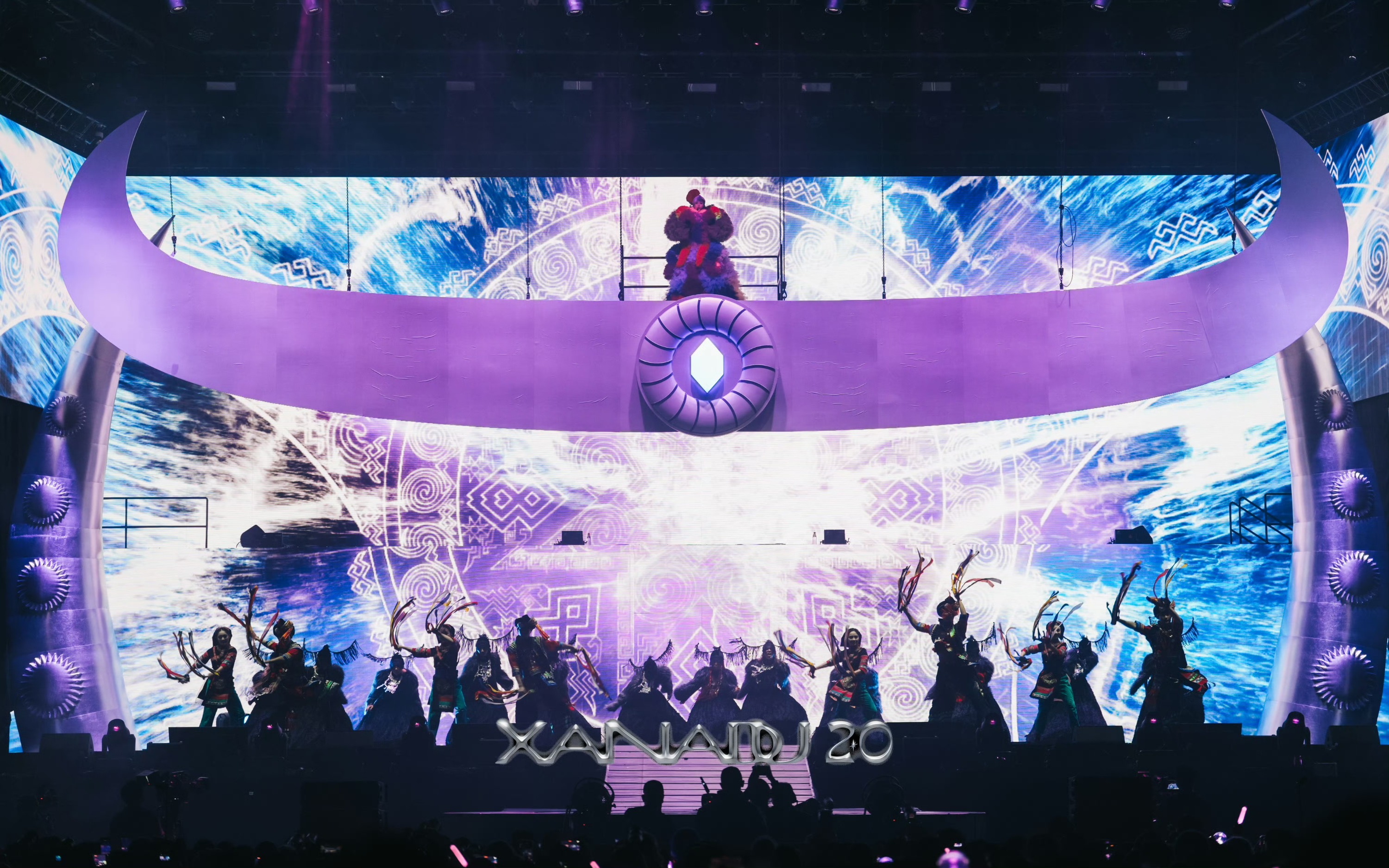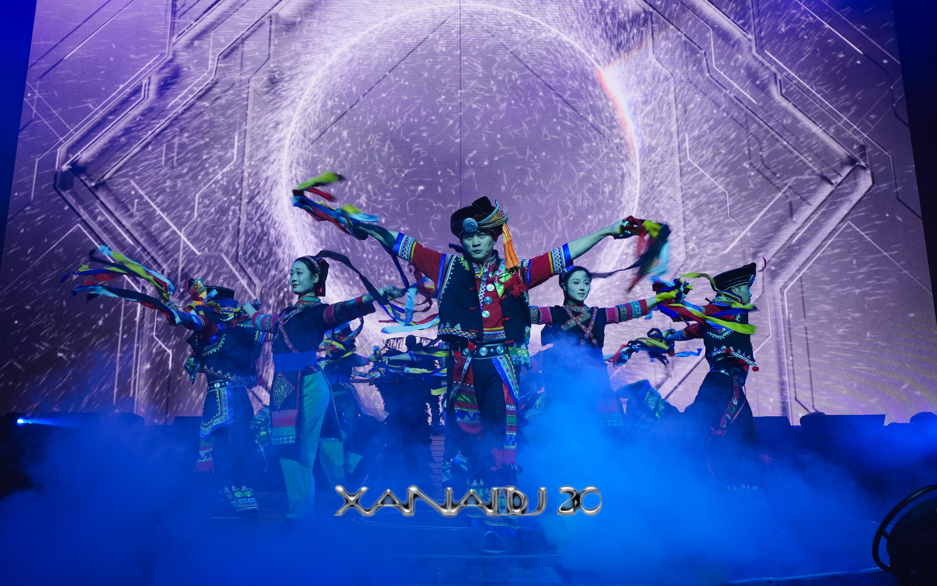 彝族铃铛舞,是贵州毕节赫章彝族传统舞蹈,2008年被列入国家级非物质文化遗产名录。在此次演唱会上创新采用传统舞者与AI机器人同台共舞的形式,将贵州彝族非遗铃铛舞与先锋电子节拍进行创新性融合演绎。“民族非遗+潮流科技”不仅让千年非遗在当代演艺舞台焕发新生机,更为非遗传承的年轻化、时尚化探索出又一路径。