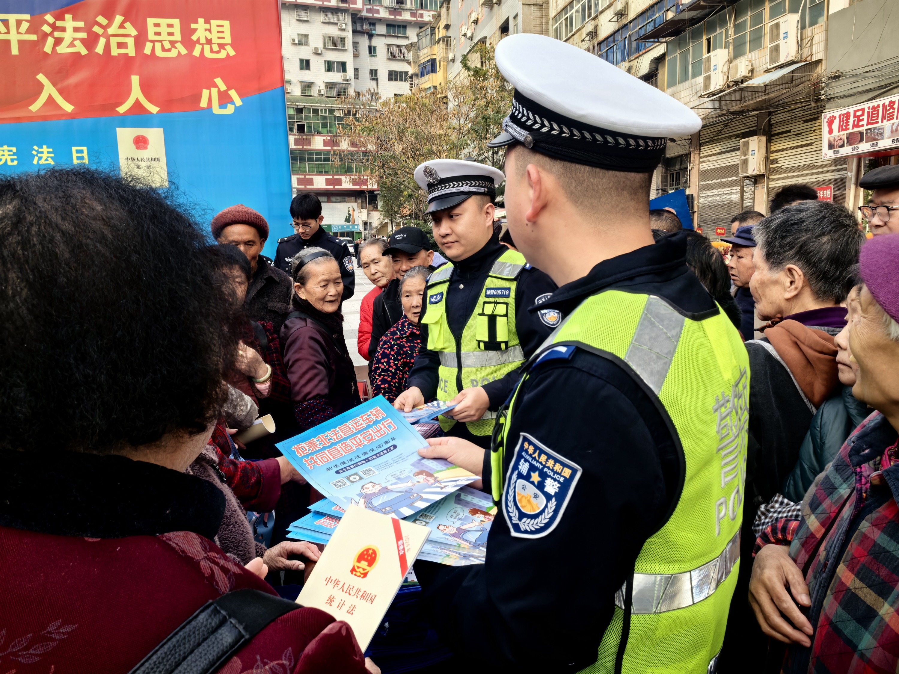 12月1日,在第十四个“全国交通安全日”即将到来之际,思南县公安局交警大队以“宪法宣传周”为契机,联合县司法局、交通运输局、市场监督管理局等部门,在思唐街道文化社区民族文化广场集中开展主题宣传活动。活动通过沉浸式、互动式宣传形式,为广大群众送上“交通安全大礼包”,积极营造全民共建文明交通的良好社会氛围。