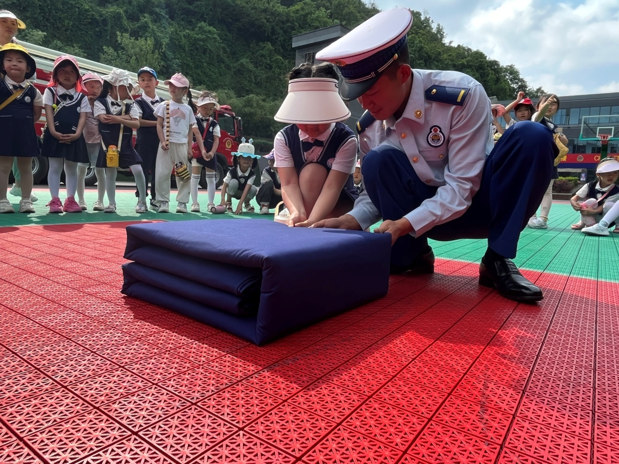 "小朋友们,你们知道火警电话是多少吗?发生火灾,我们应该怎么办呀!"消防员根据小朋友活泼好动特点,用通俗易懂的语言,以一问一答的方式充分调动小朋友的学习热情,用简洁明了的语言向师生们详细讲解了如何报火警、火场如何逃生自救等消防常识。消防员还为幼儿园师生演示了一人二带、12米爬绳、"叠被子"等硬功夫,小朋友们看完后都激动地蹦蹦跳跳,消防员们刚劲有力的动作、自然娴熟的技术赢得了全体师生的欢呼声和阵阵掌声,部分师生还在消防员的带领下登上云梯车,过足了"消防瘾"。随即,消防员现场操作并讲解了油盆火灾扑救、如何及时的将初期火灾扑灭、如何正确的针对燃烧物选择灭火器以及掌握灭火器的正确使用方法等知识,在消防员的指导下,老师们纷纷提起灭火器,竞相学习使用灭火器扑灭火灾的过程,整个活动寓教于乐,高潮迭起,现场掌声不断。