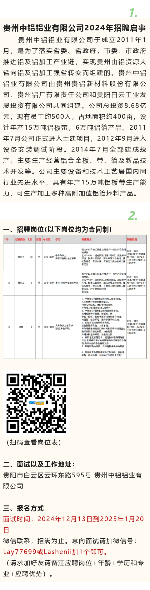 【国企】贵州中铝铝业有限公司招聘操作工、库管!员工宿舍+餐补!