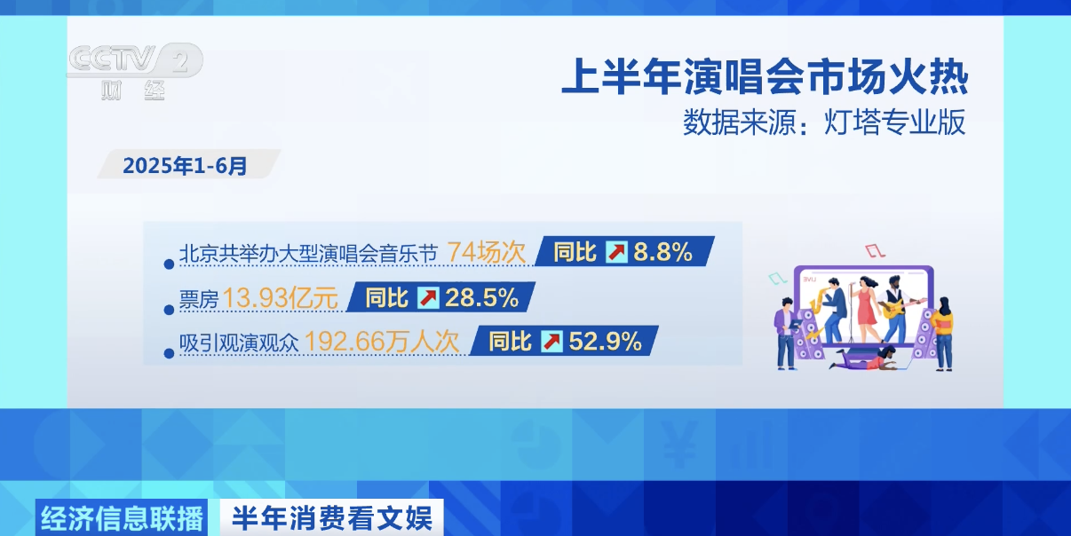 数据显示,2025年1-6月北京共举办大型演唱会、音乐节74场次,票房13.93亿元,吸引观演观众192.66万人次;同比分别增长8.8%,28.5%,52.9%。而从全国来看,今年上半年,全国演唱会票房同比增长约四成。