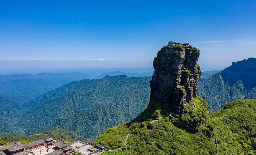 标志性的红云金顶直插云霄,两座寺庙依山而建,仅靠一座天桥相连,行走其上,如踏云端;蘑菇石历经亿万年风雨侵蚀,依然屹立不倒,似天外奇石,见证着岁月流转。这里还是黔金丝猴的栖息地,茂密的原始森林中,偶尔能看见灵猴嬉戏,为这片净土增添了几分生机与灵动。