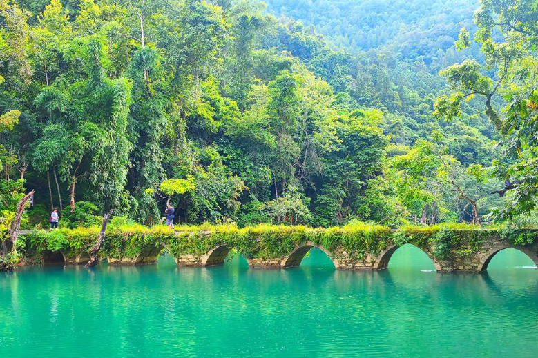 小七孔古桥横跨碧水,青石板桥身镌刻着岁月的痕迹,桥下的涵碧潭绿如翡翠,68级跌水瀑布顺着河床层层而下,水流潺潺,如歌声般温柔。大七孔的天生桥气势恢宏,崖壁陡峭,暗河蜿蜒,尽显大自然的鬼斧神工;水春河漂流惊险刺激,两岸青山对峙,翠竹依依,乘竹筏而下,能沉浸式感受“船在水中行,人在画中游”的诗意。