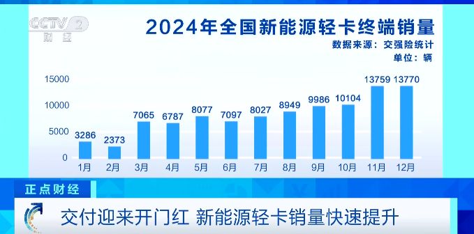 2025年1月,我国新能源轻卡市场实销4637辆,同比增长41%,创下历年来最佳首月表现。记者梳理发现,2024年,我国新能源轻卡市场累计销量近10万辆,全年有7个月销量超过8000辆,并且自10月份起,连续3个月销量突破一万辆。