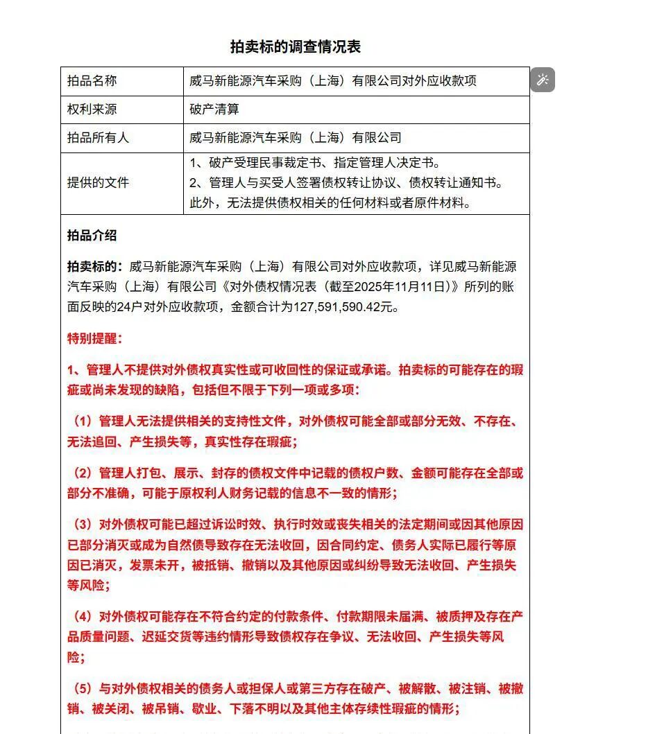 无合同、无原件、不保证真实性,威马汽车控股公司1.275亿债权9.35万元拍出