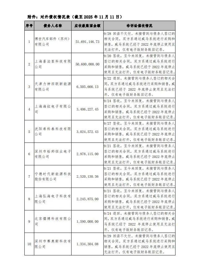 5月5日,威马汽车集团另一控股公司——威马新能源汽车销售(上海)有限公司123笔对外应收款项,金额合计为1.396亿元将进行拍卖,不过管理人提示无法提供与债权相关的任何材料或者原件材料,管理人没有接管到相关合同,仅有电子版财务账目记录。