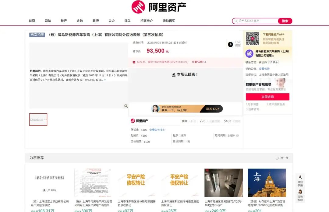 据淘宝阿里拍卖平台,威马汽车旗下威马新能源汽车采购(上海)有限公司破产清算后,1.275亿元对外应收账款以100元起拍。