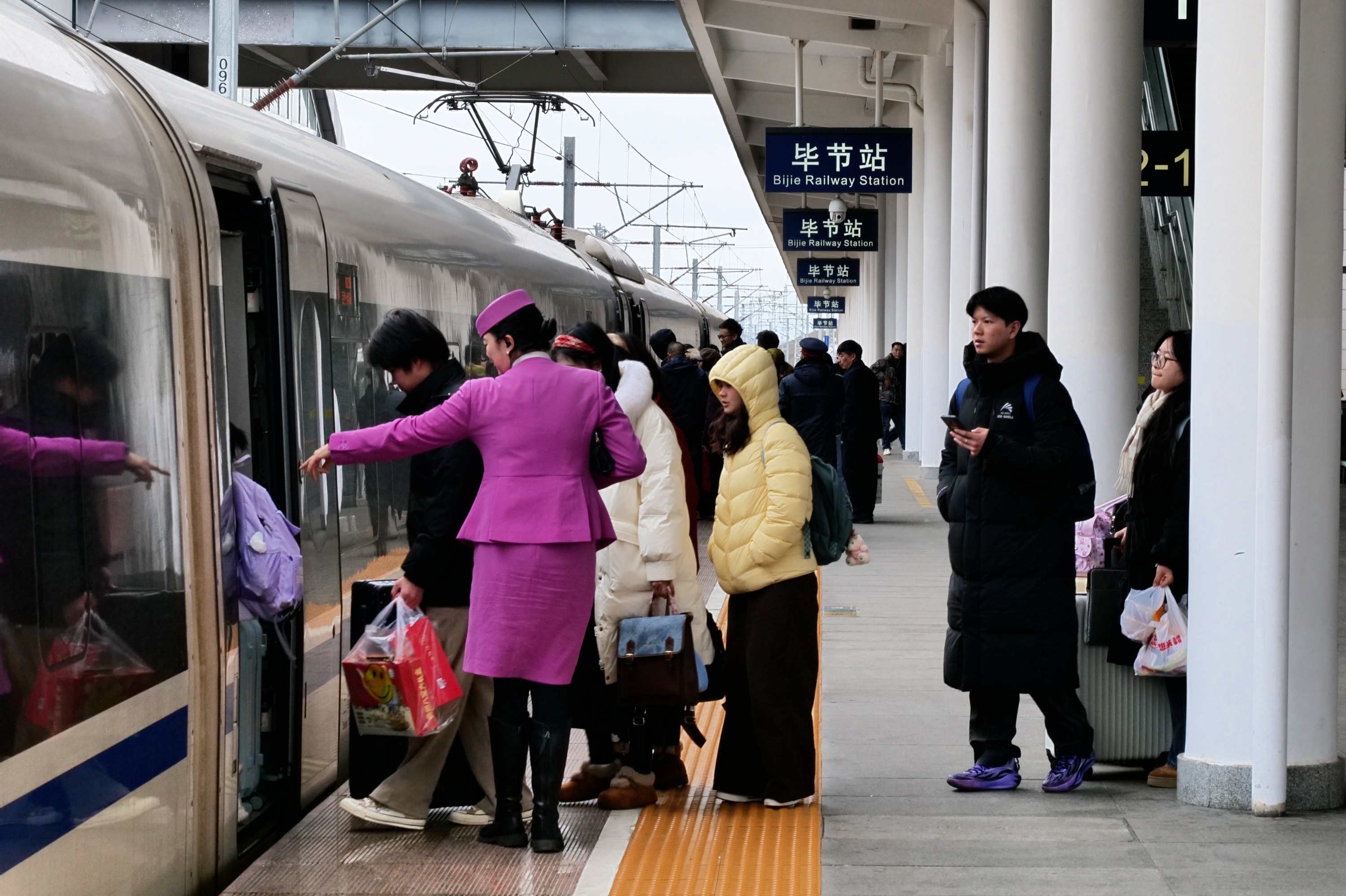 值得一提的是,元旦假期期间,盘兴高铁迎来首个小长假运输,1月1日,兴义南站刷新单日旅客发送历史纪录,共计加开44趟动车组,其中含4趟“红眼”列车,针对1月3日黔西南巅峰演唱会,兴义南站还特别加开一趟深夜“歌迷专列”,助力旅客顺畅出行;1月3日,凯里地区迎来客流最高峰,发送旅客2万人次,该段根据客流数据分析,精准把握假期“头尾长途多、中间中短途多”的出行特点,采取动车组重联运行、加开旅客列车等措施,加大了对贵阳、重庆、成都、昆明、南昌等热门方向的运力投放,增开11趟旅客列车;遵义地区发送旅客11.8万人次,该段管内各客运站根据客流提前制定应急预案,动态调整售票窗口、安检口,强化客运人员服务意识与应急处置能力,为旅客出行提供便利。