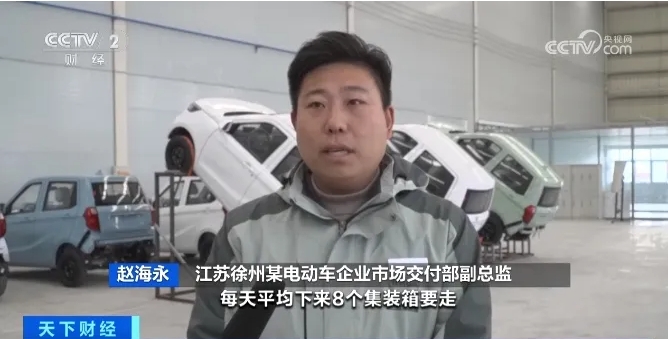 江苏徐州某电动车企业市场交付部副总监 赵海永:乘用类产品和货运类产品比较受欢迎,每天平均下来要走8个集装箱,高峰的时候每天要装20个集装箱。