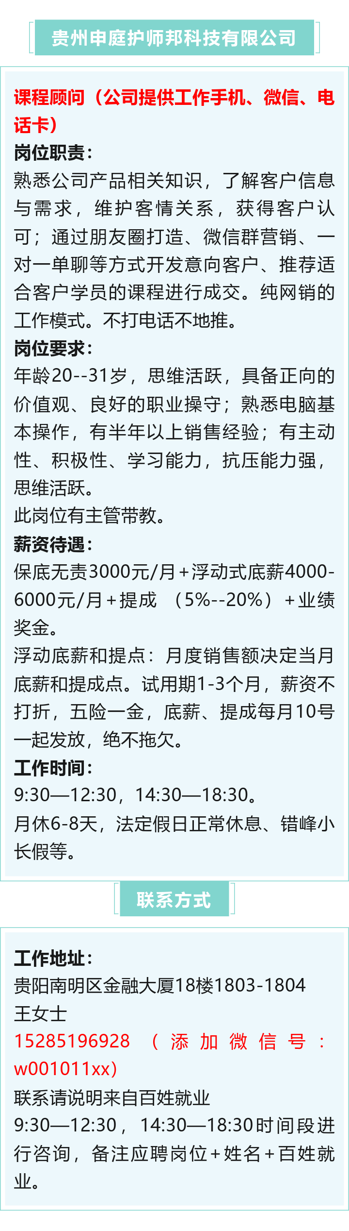 贵阳市南明区招聘!浮动式底薪4000-6000元!五险一金!