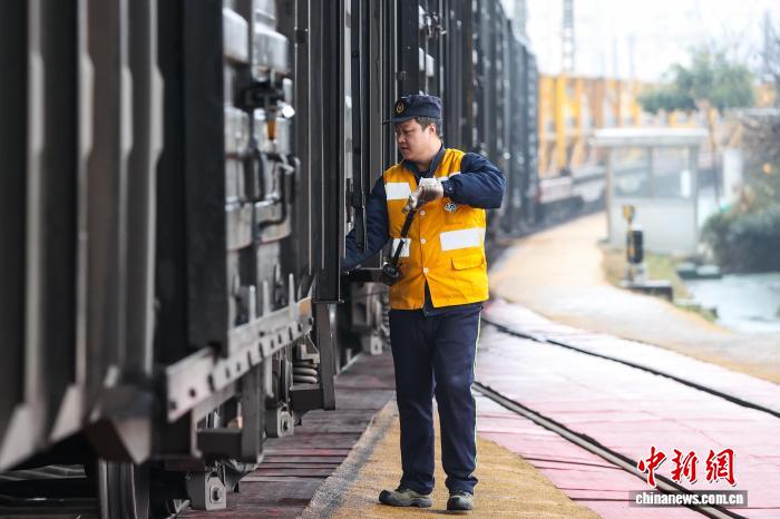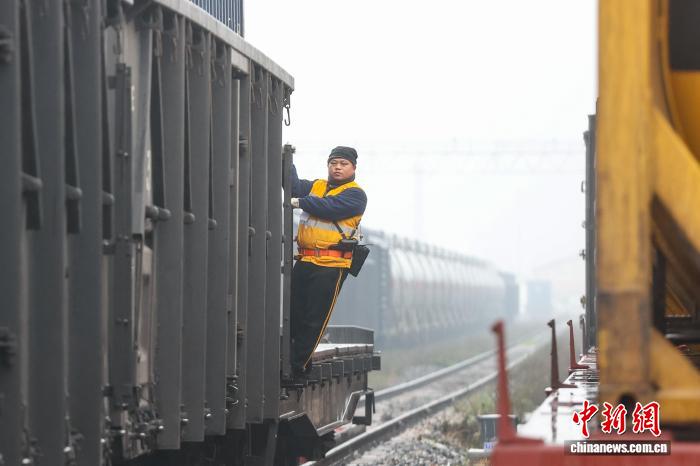 2月9日,调车组工作人员在联系司机进行连挂作业。中新社记者 瞿宏伦 摄