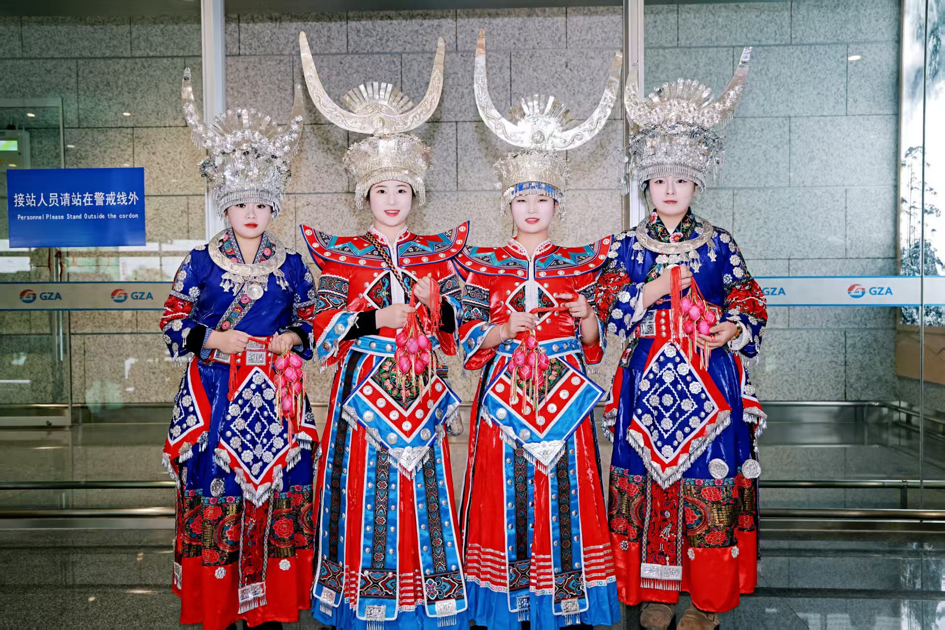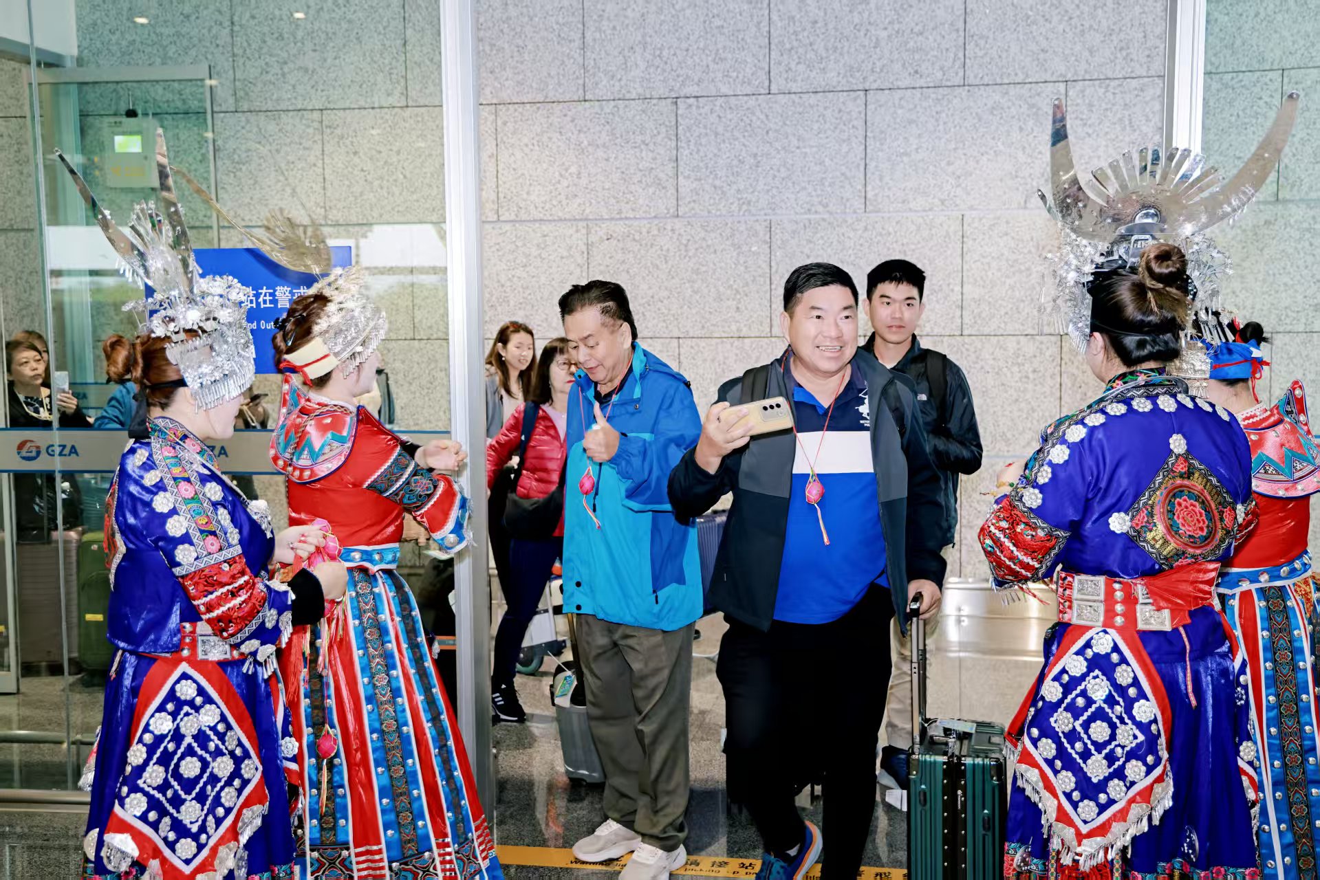 身着盛装的苗家阿哥阿妹早已就位,手持芦笙,准备迎接远道而来的贵客。随着AQ1216次航班平稳降落,首批169名来自马来西亚东马地区的游客步入到达厅,立刻被热情的欢迎队伍包围。工作人员为远道而来的朋友们挂上寓意好运的红鸡蛋,并向他们发放“贵州欢迎您”字样的手摇旗帜,一时间,欢声笑语不绝于耳。