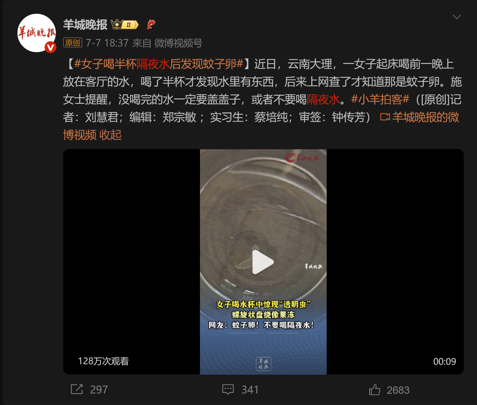 你以为隔夜水只是“不新鲜”?错!它可能正在悄悄威胁你的健康——甚至成为蚊子的“育儿房”!近日,云南大理,一女子因饮用未盖杯盖的隔夜水,竟在杯中发现有异物,查了之后发现是蚊子卵。该事件迅速引发热议,网友直呼“隔夜水真的不能乱喝!”