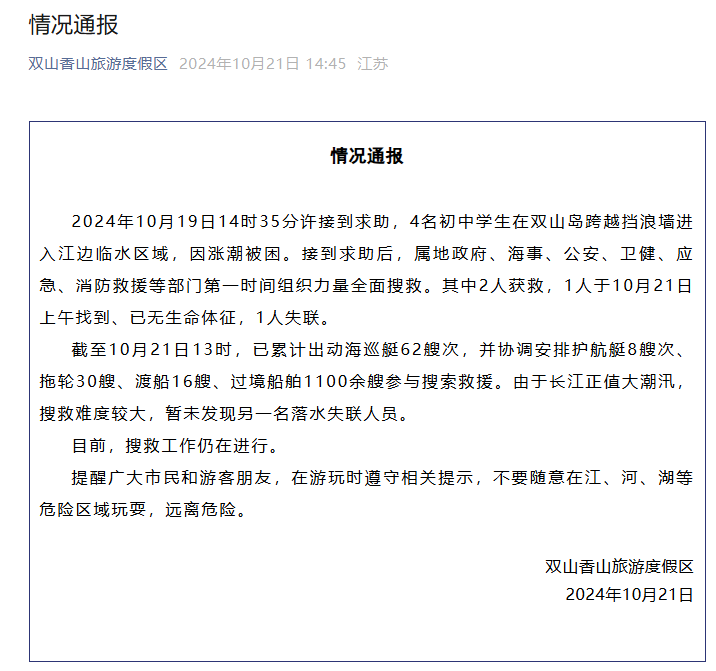 双山香山旅游度假区微信公号10月21日发布消息,2024年10月19日14时35分许接到求助,4名初中学生在双山岛跨越挡浪墙进入江边临水区域,因涨潮被困。接到求助后,属地政府、海事、公安、卫健、应急、消防救援等部门第一时间组织力量全面搜救。其中2人获救,1人于10月21日上午找到、已无生命体征,1人失联。