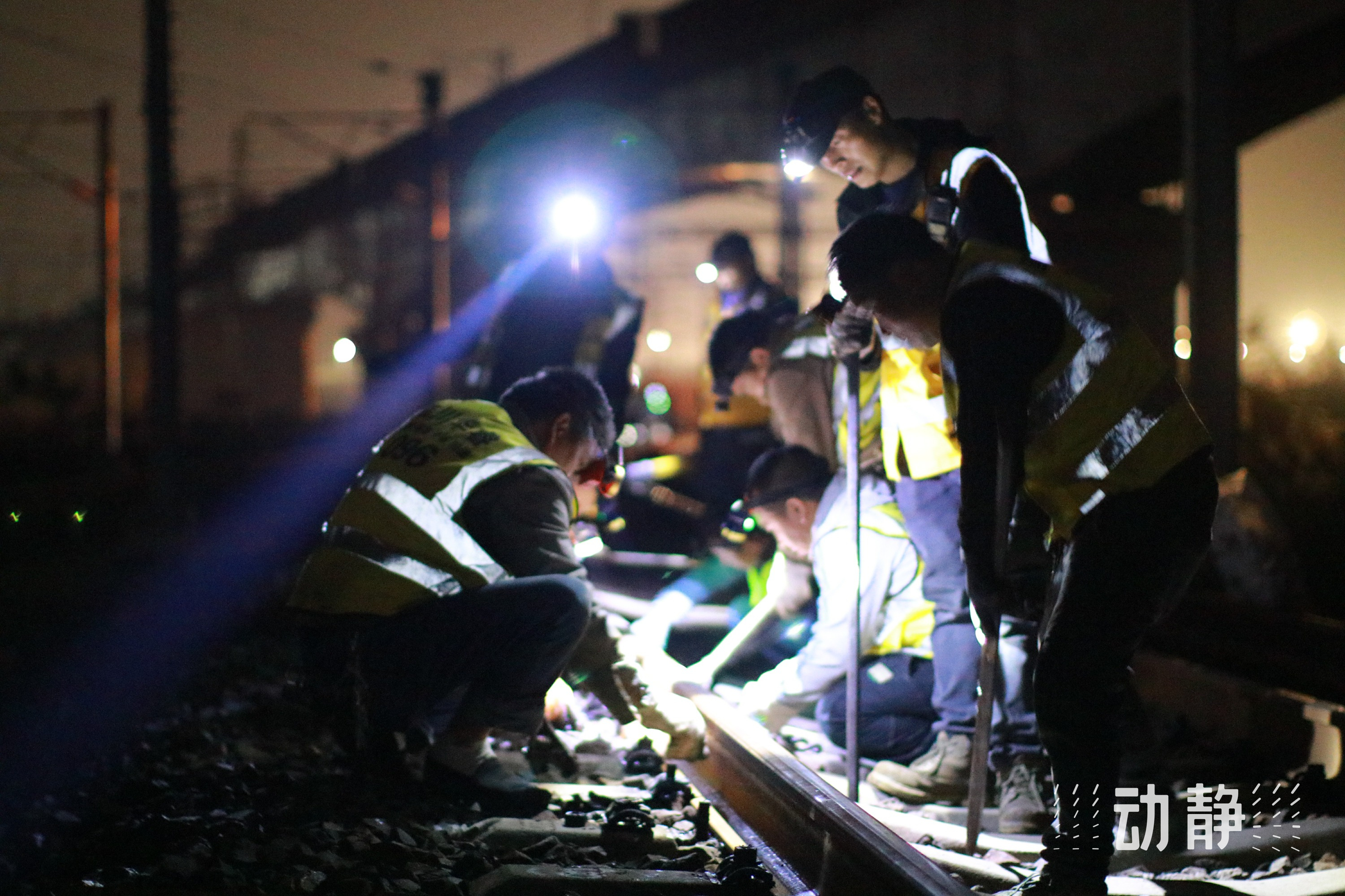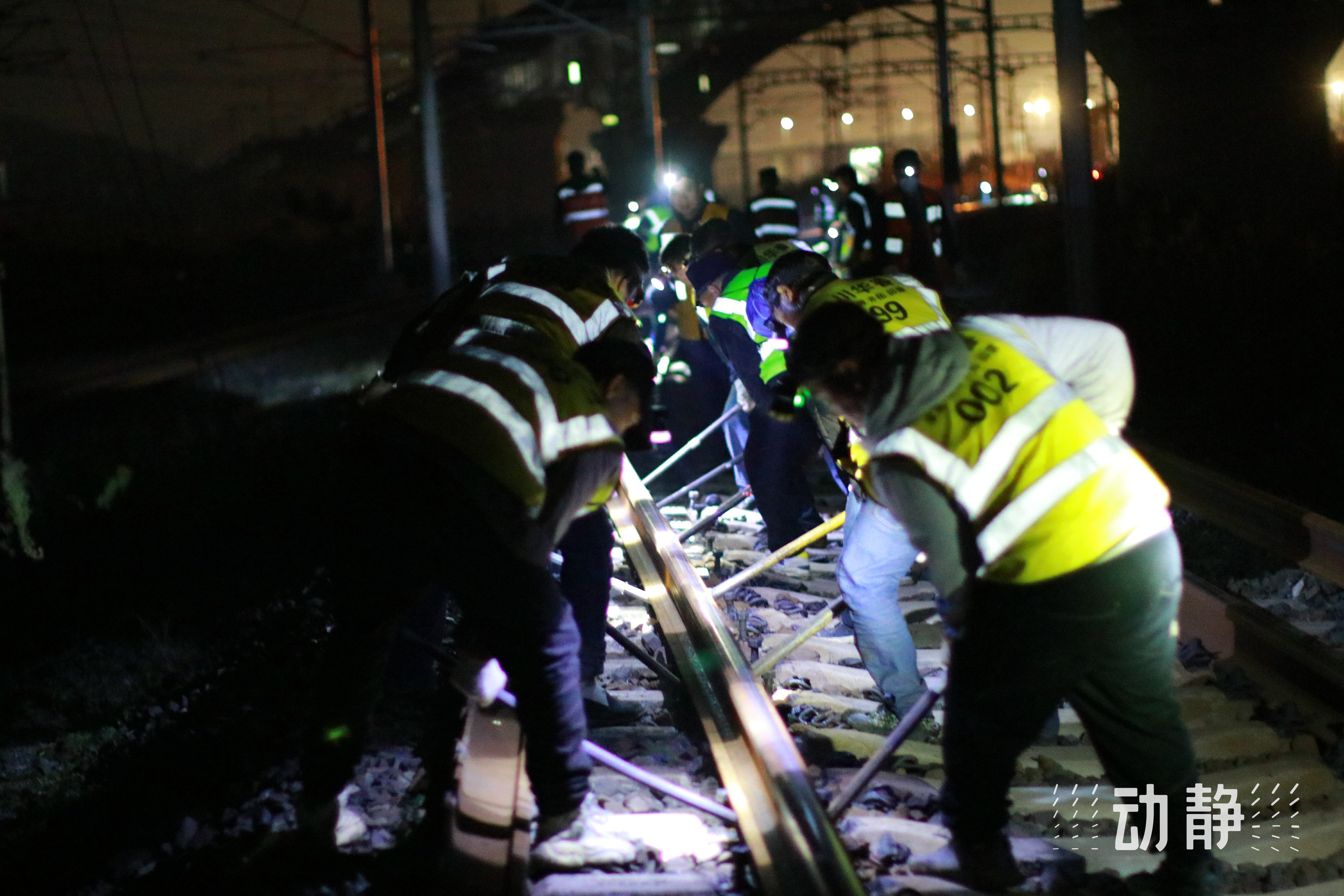 紧随着撬轨组在经验丰富老师傅指挥下,顺着待换旧轨一字排开,“一二、一二......”,作业现场不停回荡着口令声和号子声,大家紧握手中撬棍、翻轨器用尽力气,顺着长轨一点一点将旧轨撬出来,同样的方式,一旁早已备好的新轨也被翻入轨槽内……