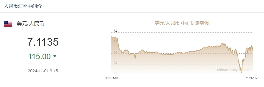 据中国外汇交易中心网站消息,中国人民银行授权中国外汇交易中心公布,2024年11月1日银行间外汇市场人民币汇率中间价为:1美元对人民币7.1135元,上调115个基点。