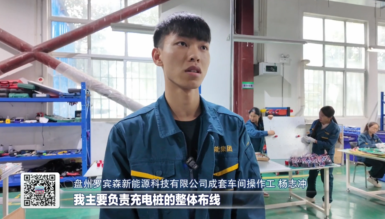 盘州罗宾森新能源科技有限公司成套车间操作工杨志冲告诉记者,他主要负责充电桩的整体布线,现在他们的生产任务排得满满的,他有责任在交货期内和大家一起保质保量的把充电桩生产出来,及时将产品交付到客户手中。