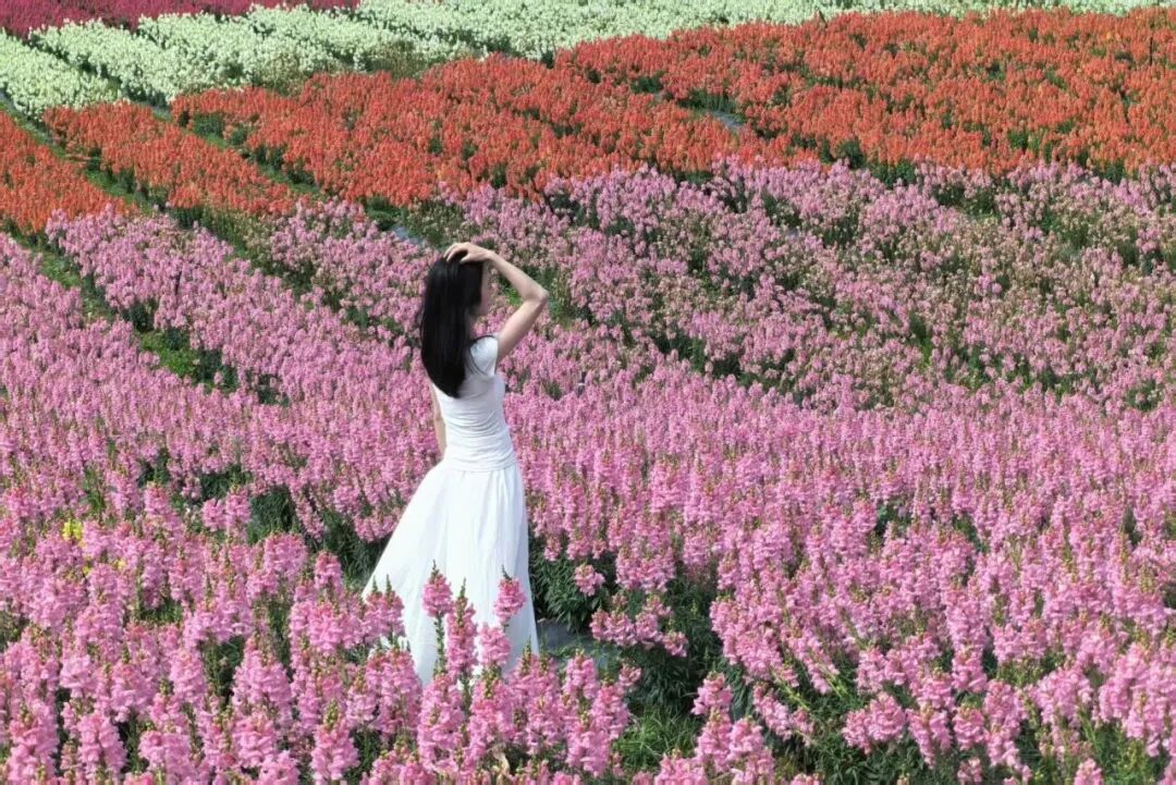 粉白梨花、粉红桃花层层叠叠,粉黛如烟,梨花雪海与油菜花金黄交织成海相映,穿汉服漫步其间花香四溢,尽显田园诗意,仿佛穿越回古风画卷。