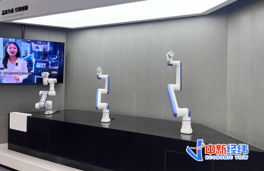 展厅现场,一只机械臂在人靠近时能迅速自主避让。据现场技术人员介绍,这款机械臂搭载了国际领先的非接触检测“安全皮肤”技术,在生产线上作业时,它可以检测15厘米范围的障碍物,并主动停止或绕行,避免人与机器碰撞,从而确保安全与效率的最大化。