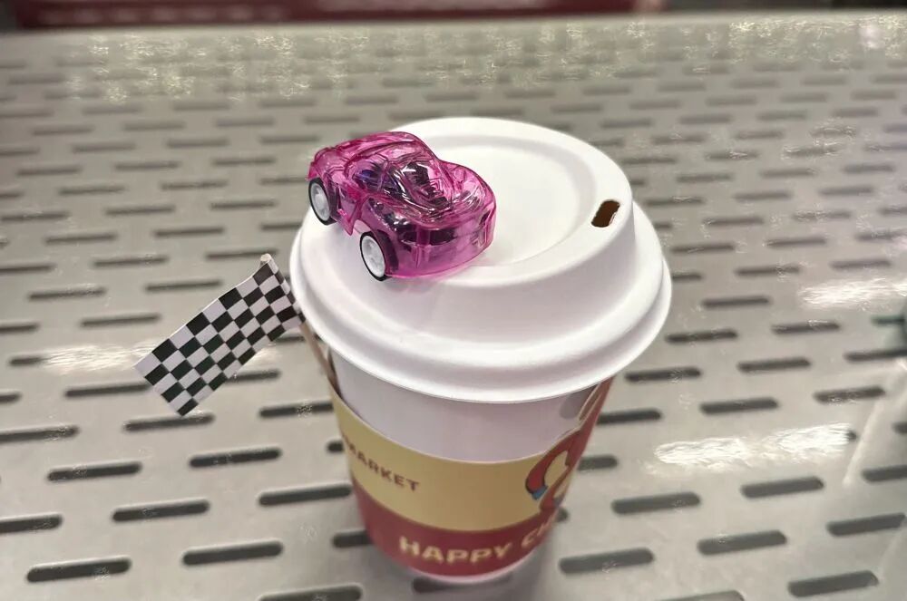 迷你车模静静卧在杯沿
