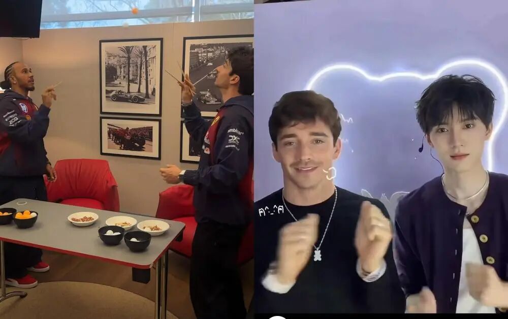 △ 勒克莱尔(右图左)玩手势舞、与汉密尔顿挑战用筷子夹乒乓球