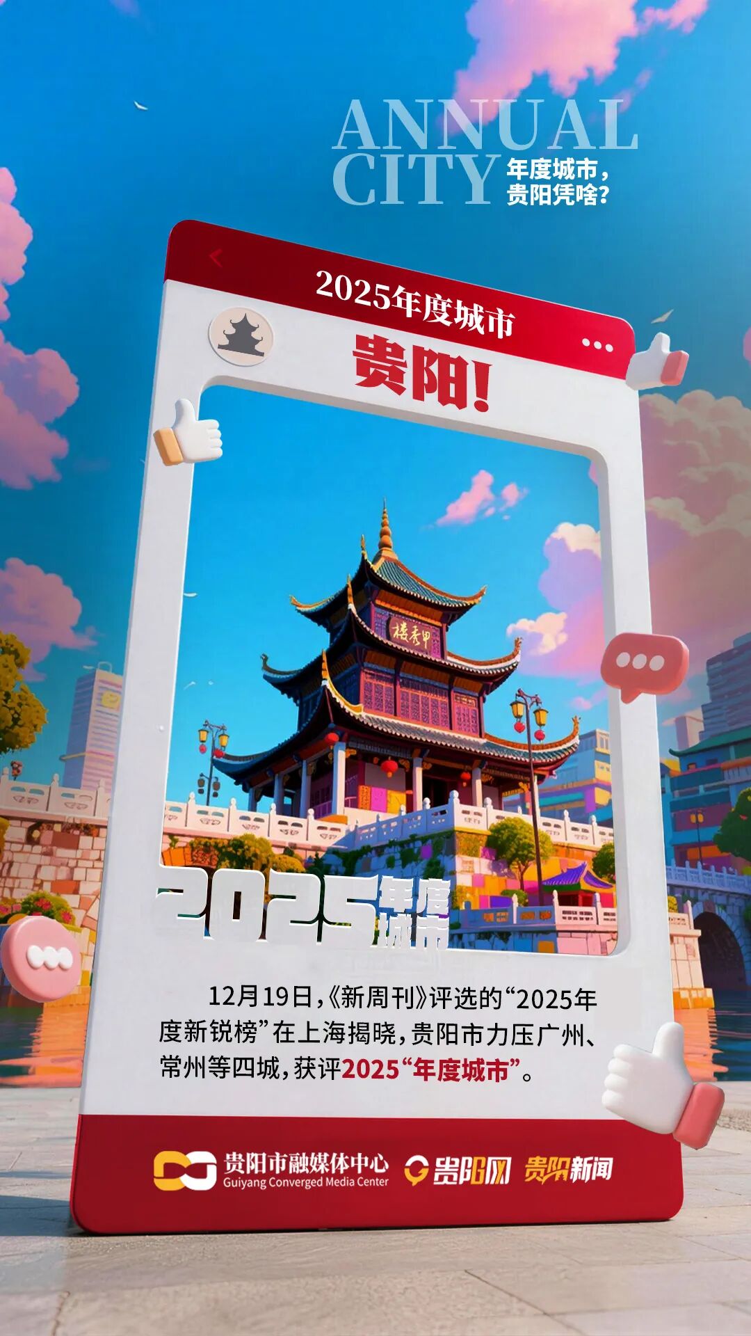 近日,《新周刊》主办的“2025中国年度新锐榜荣誉盛典”在上海举办,贵阳获评2025“年度城市”。“贵阳是赛博朋克与田园牧歌的共生体,在快时代的洪流中,它用一杯咖啡的闲暇和一首歌的时间,留住了人间烟火。”《新周刊》如此评价2025“年度城市”贵阳。