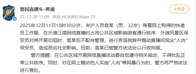 20日,上海市公安局黄浦分局官方微博发布通报称,近日,来沪人员袁某身着网上购得的快递员工作服,在外滩江堤网络直播时占用公共区域影响游客通行秩序,被保安员劝阻时拒不配合,喊话粉丝“人肉”保安员,造成恶劣社会影响。目前,袁某已被警方依法处以行政拘留。警方提醒:对在网上煽动他人实施“人肉”等网暴行为的,警方将严格依法进行查处。