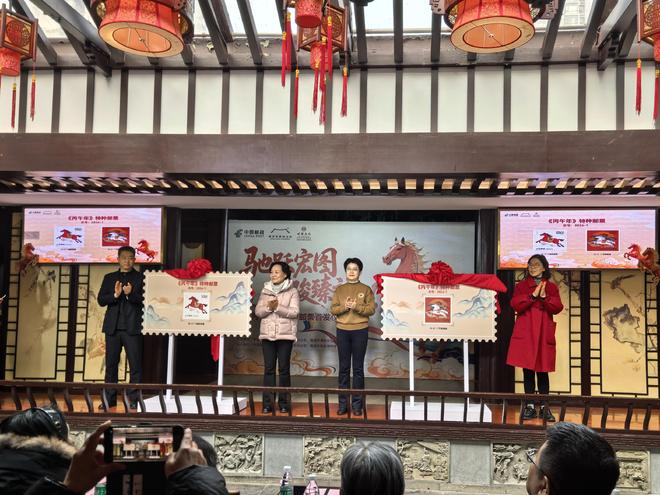 1月5日,《丙午年》生肖邮票如约而至,和广大市民在南京市民俗博物馆见面。邮票首发、专家分享马年民俗文化、南京白局表演等丰富活动,为广大市民奉献了一场精彩的文化盛宴。“驰骋千年·马韵中华”中国马主题邮票展也于当日在南京生肖邮局启动,通过方寸艺术呈现马在中华文化中的精神象征,为观众开启一段跨越千年的驿路文明之旅。