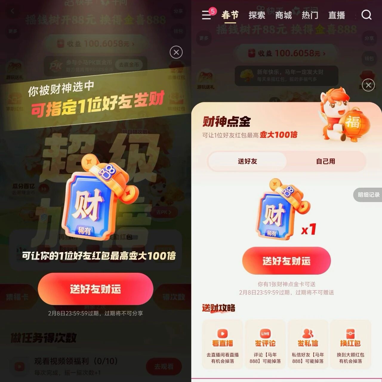 另一项被广泛讨论的玩法是“财神点金卡”。该卡片可以将红包金额最高放大100倍,并支持好友之间转赠。在某主播评论区,为求一张点金卡,网友累计刷出超过300万条评论。由于数量稀缺且可能带来高额收益,“财神点金卡”逐渐成为春节期间的一种“社交货币”,不少用户会主动分享或讨论这一道具,从而带动更多互动与传播。