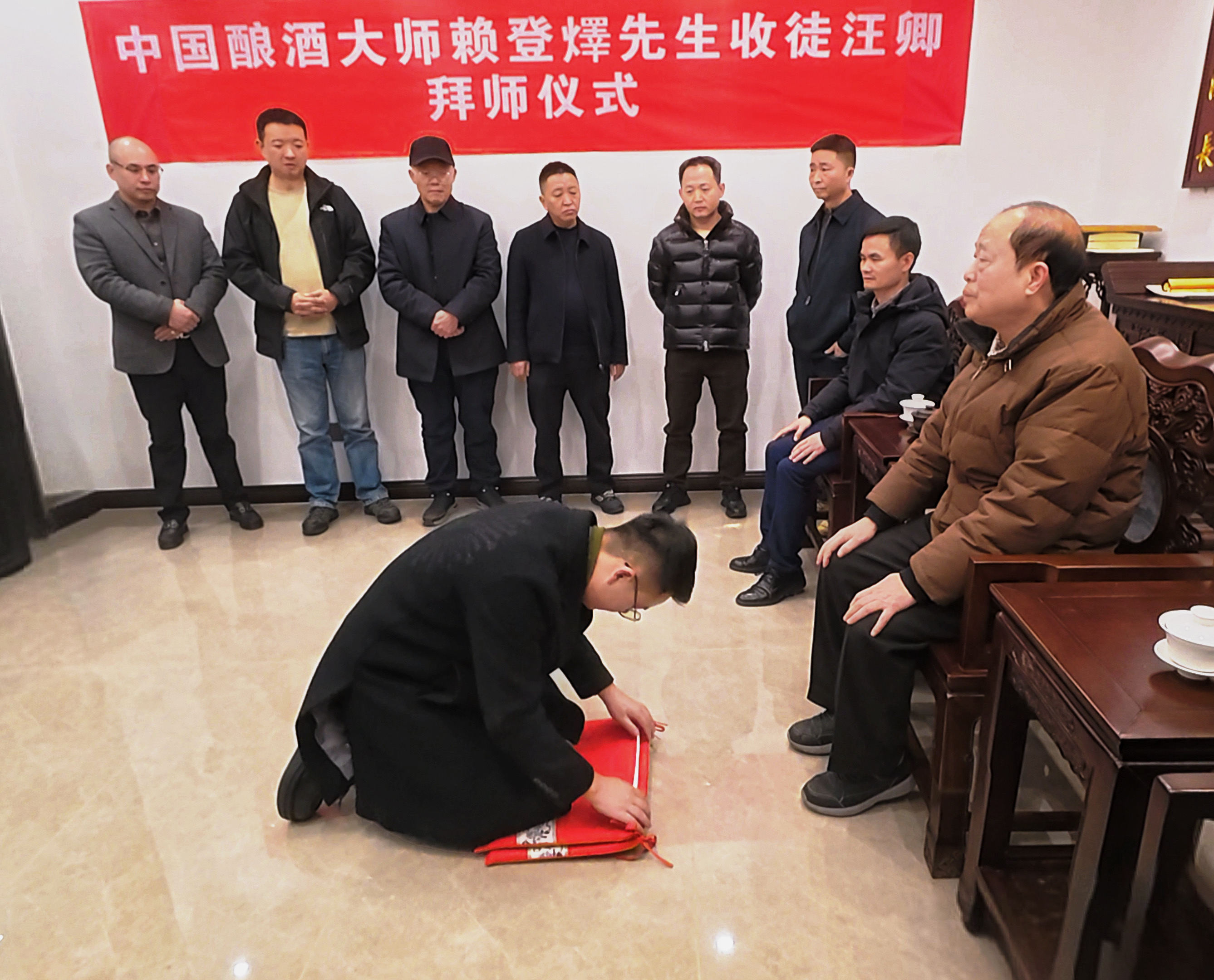 2026年1月8日,国家级非物质文化遗产白酒酿造技艺代表性传承人赖登燡先生收徒仪式在中国酒都仁怀隆重举行。仪式严格遵循中国白酒行业千年传承的拜师礼仪,由泰斗教育教导主任于文芳主持,泰斗教育校长陈林担任引师,贵州省产品质量检验检测院仁怀分院副院长、国家特邀评委、贵州省白酒专家委员会成员徐兴江担任保师,众多行业专家、企业同仁齐聚一堂,共同见证这场跨越半世纪匠心的传承盛典,见证白酒非遗技艺的薪火接力。