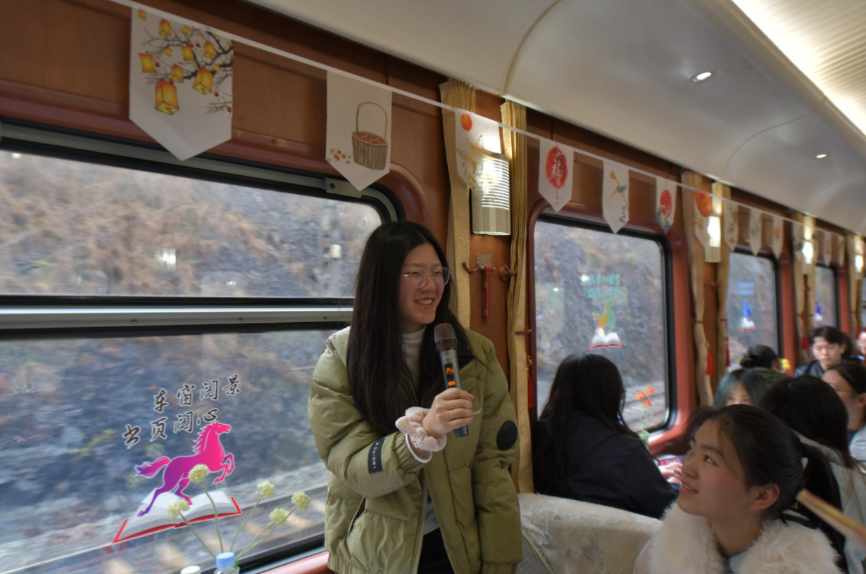 “击鼓传马”之围读分享会更是成为全场亮点,马年吉祥物在学子们手中依次传递,锣声骤停,拿到吉祥物的学子们便大方分享读书心得、新学期学业规划或是家乡的旅行见闻,还有各式各样才艺表演。一时歌声、笑声在车厢里久久回荡,原本陌生的学子们,在互动交流中拉近距离,结下了别样的旅途友谊。