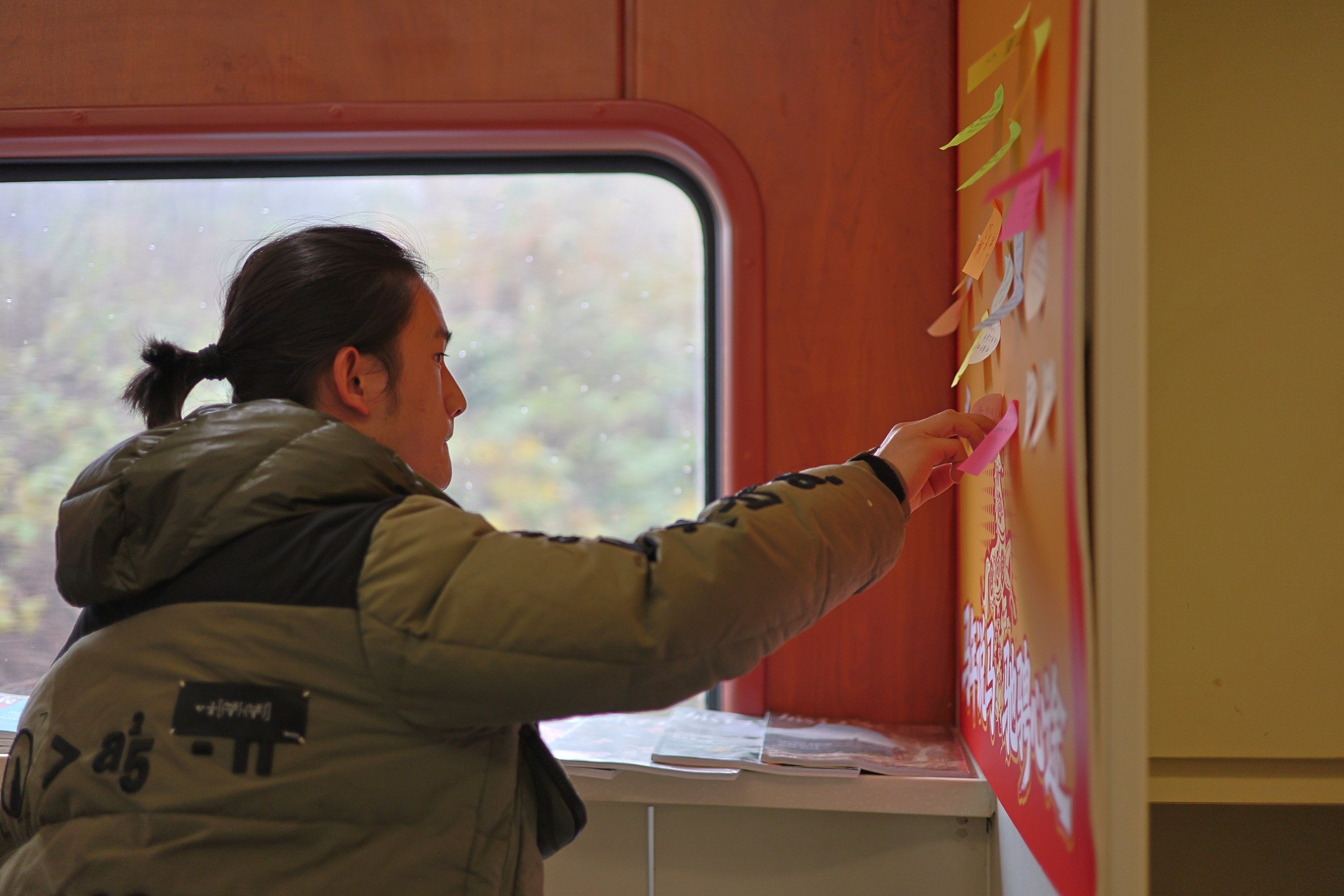 车厢一角,“致未来”便签打卡区前围满了人,学子们拿起彩笔,在便签上写下对活动的暖心评价,也留下对来年列车书吧的美好建议,一张张便签贴满打卡栏,是对此次活动的肯定,更是对未来列车书吧的美好期许。大家纷纷手持创意合影板,定格下这场书香之约的美好瞬间,让青春的笑容与浓郁的书香,留在这节流动的列车上。