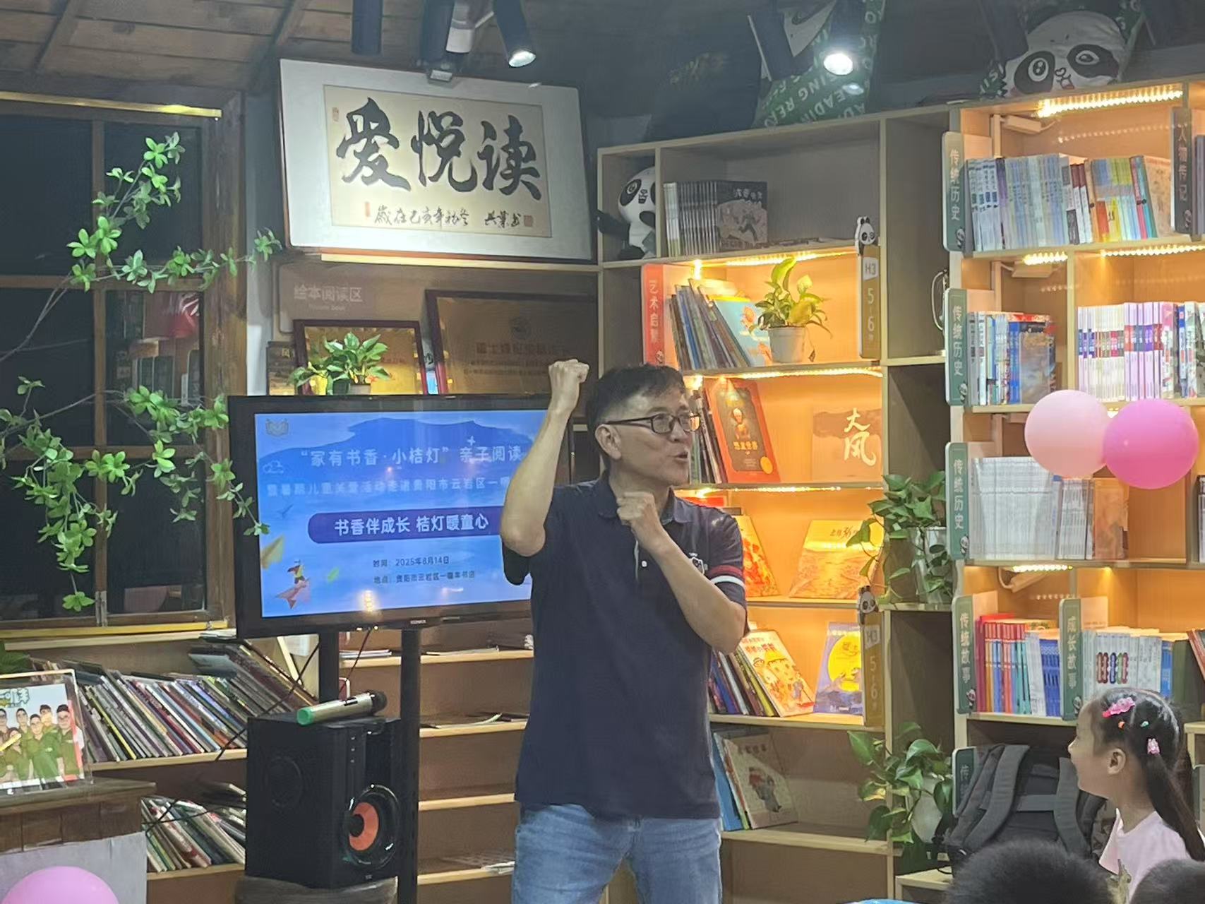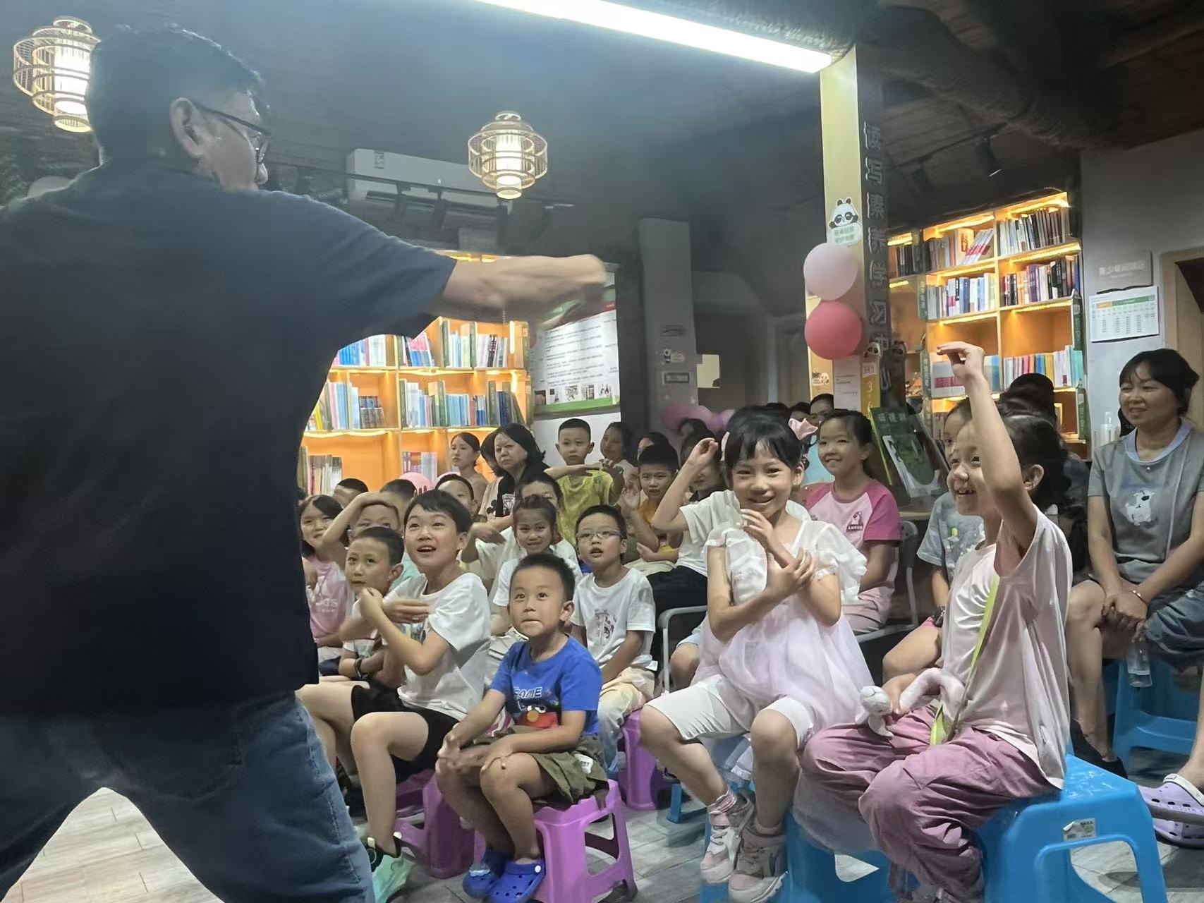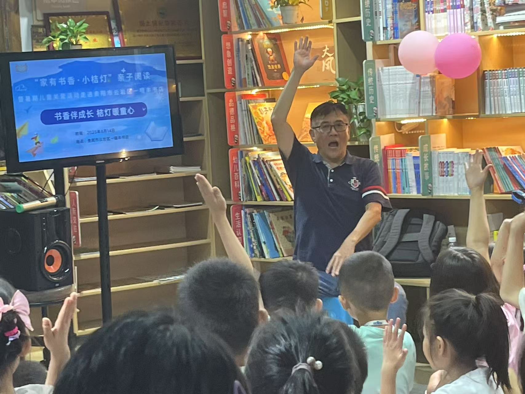 2025年8月14日,【书香伴成长 桔灯暖童心】 “家有书香·小桔灯”亲子阅读暨暑期儿童关爱活动走进了贵阳市云岩区一喔丰书店。被誉为“亚洲最会讲故事的人”的张爸爸(张大光)给大家带来了一场充满魔力的亲子故事会。活动现场座无虚席,家长与孩子们共同沉浸在《牧羊豹》《六人闯天下》《神奇树屋》三个精彩故事的奇幻世界中,笑声与掌声不断。