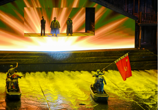 就在这时,红军渡江的战船在舞台烟雾的掩护下腾空而起。随着战船的起航,红军战士们在浪湍水急中,跨险滩、搏激流,迅速穿越了金沙江。他们的身影与瀑布的水流交织在一起,形成了一幅壮丽而动人的画卷。