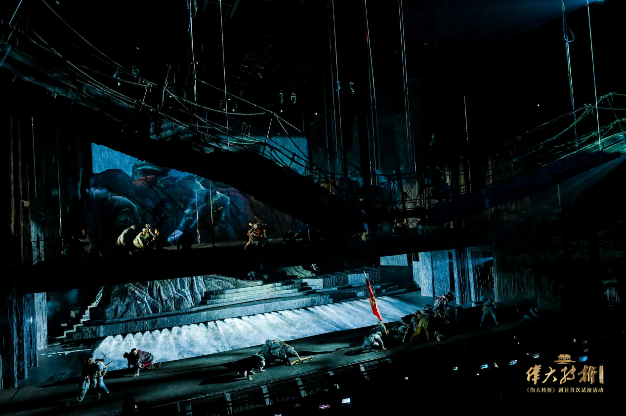 这是中国大型长征文化沉浸式演艺——《伟大转折》剧目演绎的红军抢渡金沙江的震撼场景,也是伟大转折剧场舞台“水动全场”的精彩缩影。