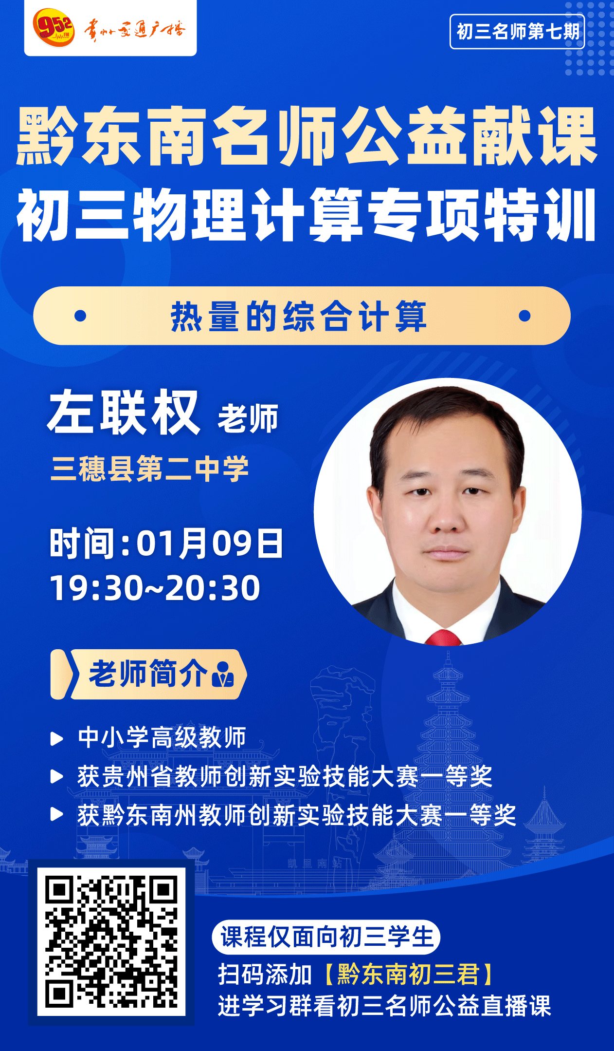 1月9日本周五、1月10日本周六每晚19:30初三物化期末冲刺!贵州广播电视台交通广播黔东南名师公益直播课免费解锁提分密码!
