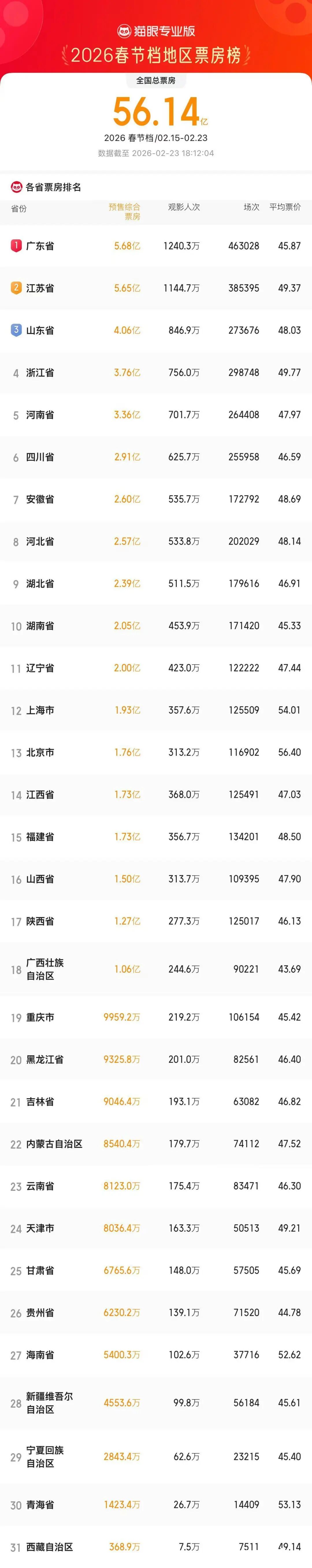 数据显示,截至2月23日18时,广东春节档票房突破5.68亿元,自2021年后重返第一,自大年初四起日票房保持第一。全省放映场次达46.3万场,吸引超1240.3万人次观影,双双领跑全国;平均票价45.87元,低于全国水平,“低价惠民”策略有效撬动了下沉市场消费潜力。