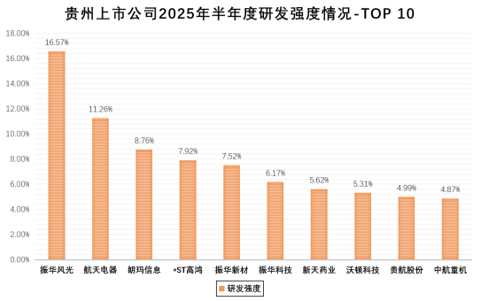 从具体情况来看,贵州共有24家公司的研发强度超过2.12%的全国均值、20家研发强度超3%、8家研发强度超5%,其中振华风光以16.57%的研发强度位居首位。