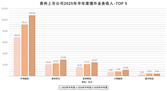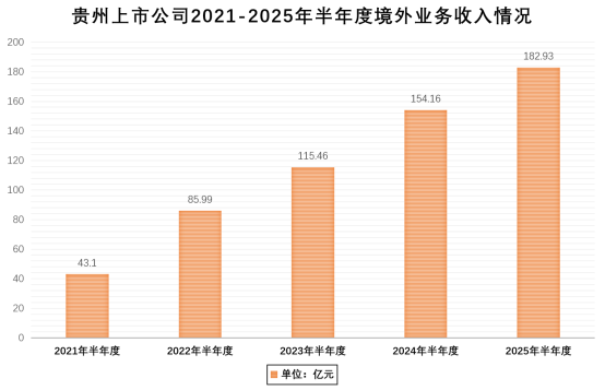 随着贵州上市公司产品不断创新突破,科技含量不断提升,海外市场持续巩固拓展,2025年上半年共有13家公司披露境外业务收入数据,总计实现收入182.93亿元,同比提升18.66%,参与公司数量和收入规模均创下历史新高。