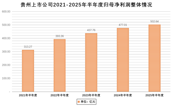 从整体情况看,贵州上市公司2025年上半年实现归母净利润总额502.64亿元,位居全国第9位、西部第2位,较去年同期提升5.37%,较2021年半年度增长60.45%。2021-2025年半年度,贵州上市公司归母净利润整体保持连续正增长,以12.55%的复合增长率位居全国第1,增长明显、势头良好,展现出贵州经济高质量发展的强劲韧性与活力。