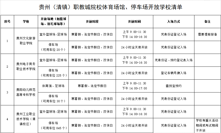 为提高市民群众幸福感满意度,提升广大游客到清镇游玩体验,即日起清镇职教城各院校体育场馆、停车场实行定时定点对外开放,具体事宜公告如下: